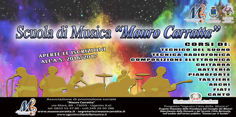 Aperte le iscrizioni all’A.S. 2016-2017 della Scuola della Muscia MAURO CARRATTA. Al via i corsi di Tecnico del suono, Tecnica radiofonica, Composizione elettronica – dj, Chitarra, Batteria, Tastiere, Pianoforte, Archi, Fiati e Canto.