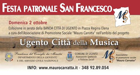 | Nell'ambito del progetto Ugento Città della Musica, si comunica che Domenica 2 ottobre vi aspettiamo a Gemini (Ugento) per l'esibizione della giovane banda "Città di Ugento" in occasione della festa patronale in onore di San Francesco. |