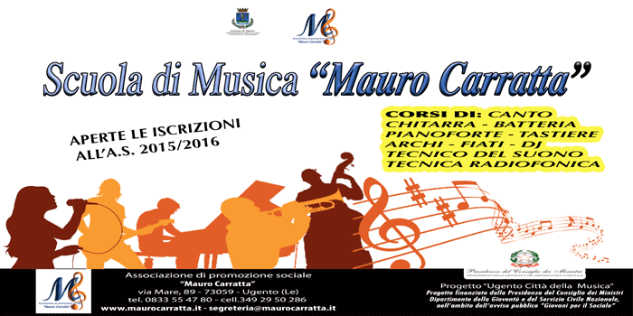 L’Associazione di Promozione Sociale MAURO CARRATTA in partnership con il Comune di Ugento – Assessorato Spettacolo e Politiche Giovanili, promuovono nell’ambito del Progetto “UGENTO CITTÀ DELLA MUSICA” cofinanziato dalla Presidenza del Consiglio dei Ministri – Dipartimento della Gioventù e del Servizio Civile Nazionale, mediante l’Avviso Pubblico “Giovani per il Sociale”, la SCUOLA DELLA MUSICA “Mauro Carratta”, che prevede lo svolgimento di n°. 9 corsi di formazione musicale, nel dettaglio: