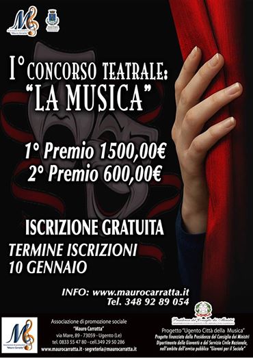 Musica. L’iscrizione al concorso è a titolo GRATUITO. Una volta superata la fase di preselezione, si prevede solo il costo d’iscrizione all’A.p.s. MAURO CARRATTA pari ad € 30,00 per ogni componente della compagnia, che verrà utilizzata per coprire i costi assicurativi di tutti i partecipanti al concorso. Il concorso prevede la premiazione delle prime due opere classificate, con premi in denaro e trofei, rispettivamente € 1.500,00 per il 1° classificato € 600,00 per l’opera che si classificherà al 2° posto. Le richieste di iscrizione alle preselezioni dovranno essere presentate a mano, tramite email o a mezzo posta presso la sede dell’Associazione di Promozione Sociale MAURO CARRATTA, via Mare n. 89 – 73059 Ugento (LECCE) entro e non oltre le ore 24.00, del 10 gennaio 2017, utilizzando l’apposito modulo allegato al bando. |